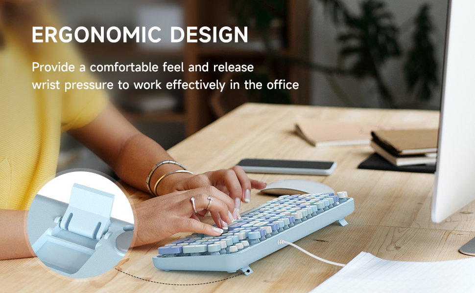 - 【Ergonomic Design】There is a foldable stand on the back of the keyboard to reduce hand fatigue, and standard PC keyboard layout with full-size design providing a very pleasant typing experience. Excellent for your daily use.