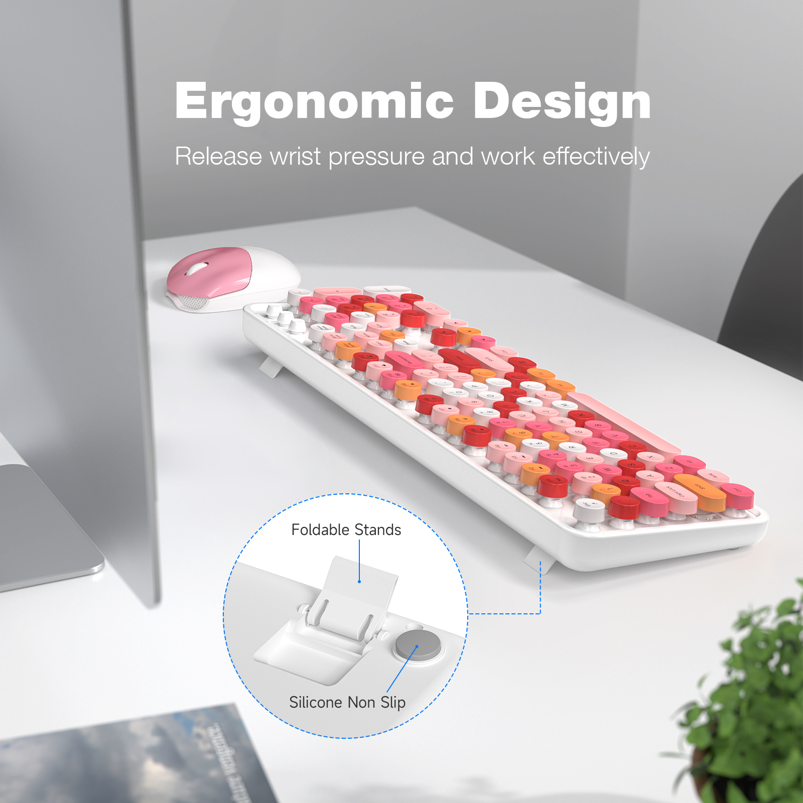 - Wireless keyboard is ergonomically designed with folding holder and anti-slide pads that can keep it at an optimum slope, prevent your wrists from hurting while long sessions of typing.